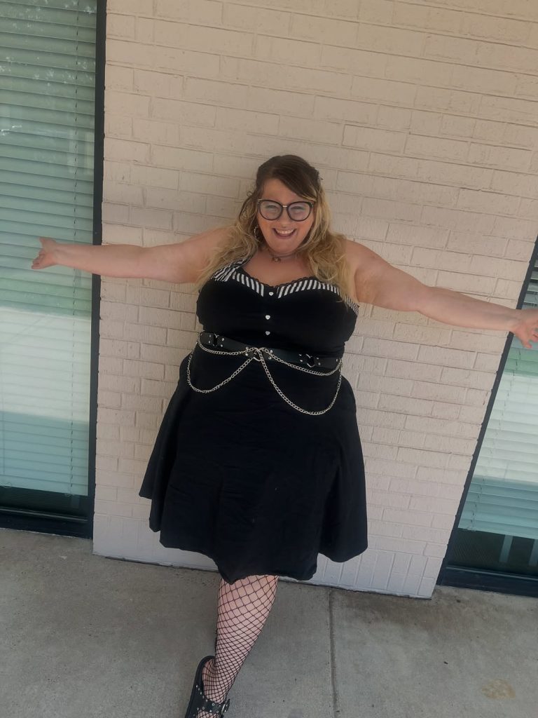 Wear this to live shows, themed parties, or any night out where you want your outfit to match the volume of the playlist. A leather jacket would slide seamlessly over the dress for fall evenings, while a red lip pushes it deeper into rockstar territory. Skip delicate ballet flats or dainty jewelry—the whole point here is leaning fully into your inner frontwoman in plus-size outfits with 2026 ideas.