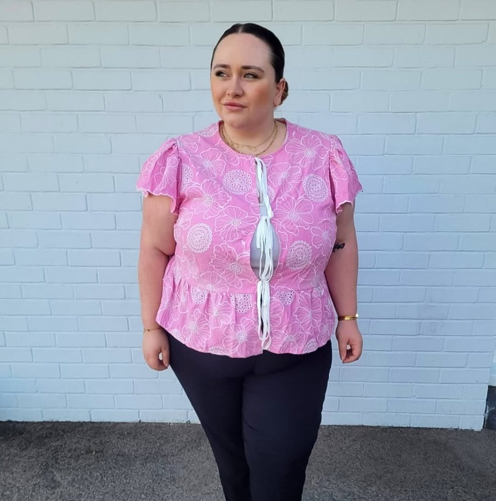 - Pink eyelet blouse with floral pattern, flutter sleeves, peplum hem