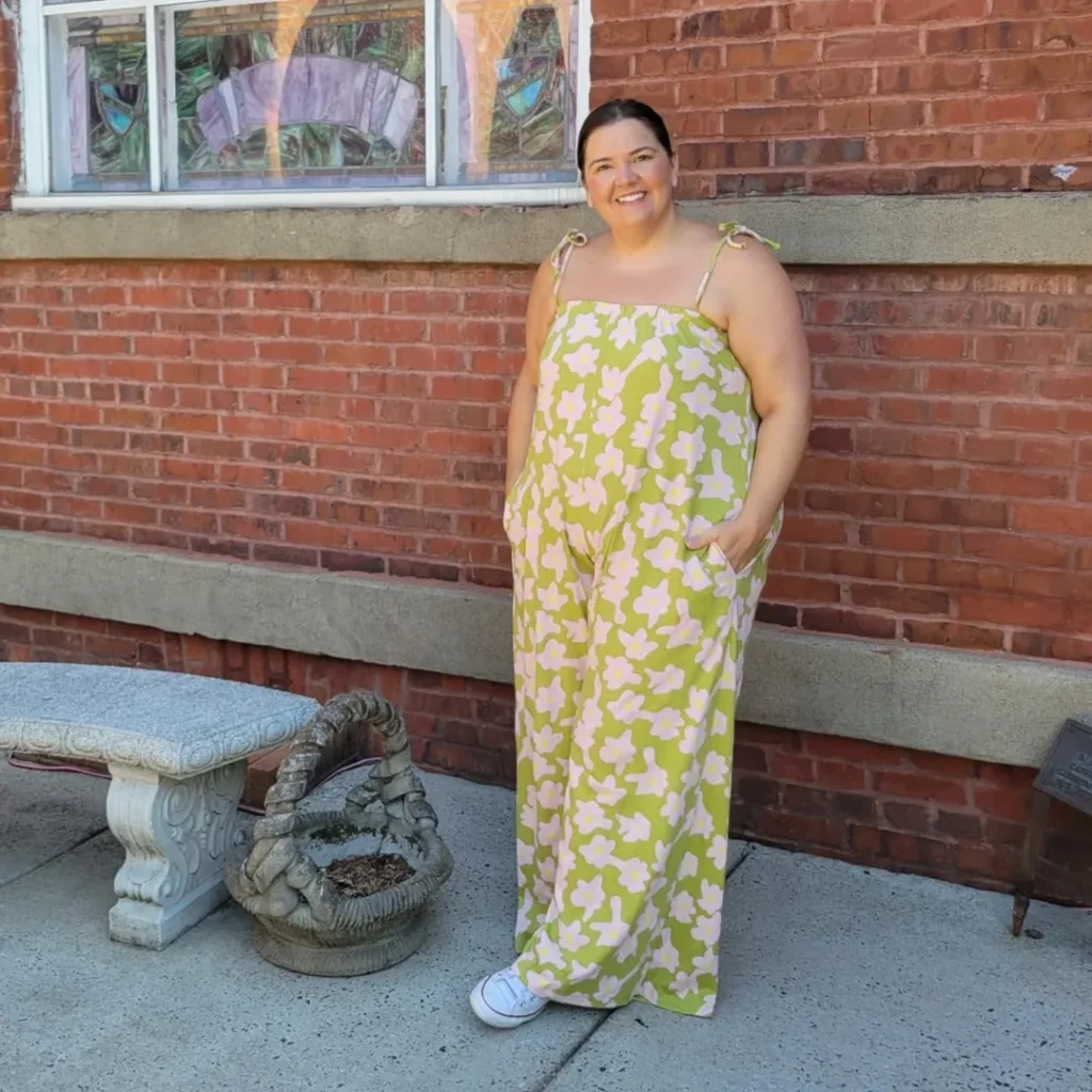 A wide-leg floral jumpsuit in lime and blush reads like wearable sunshine—easy, breezy, and perfectly cute for relaxed summer days.
