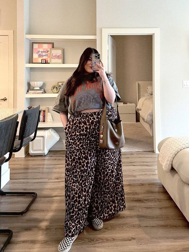 A faded band tee meets wide-leg leopard pants, delivering peak OOTD casual curvy energy with a whisper of skater-girl nostalgia.