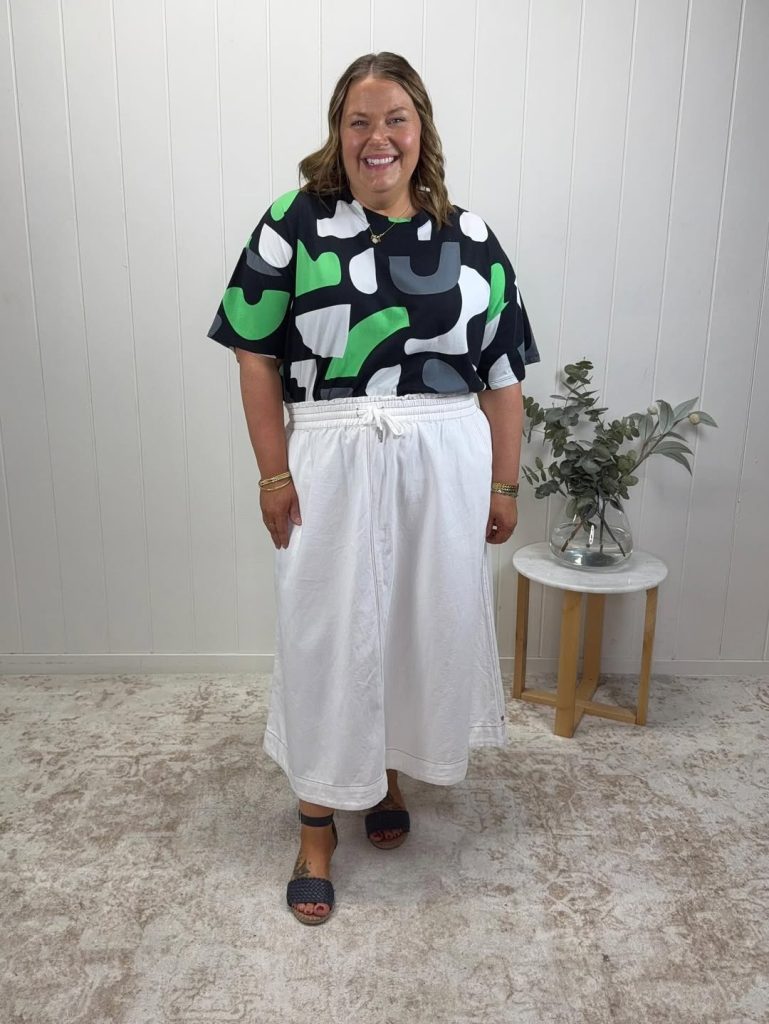 A bold abstract tee and easy white skirt create a cute everyday uniform, ideal for summer errands and coffee runs for women who love color.