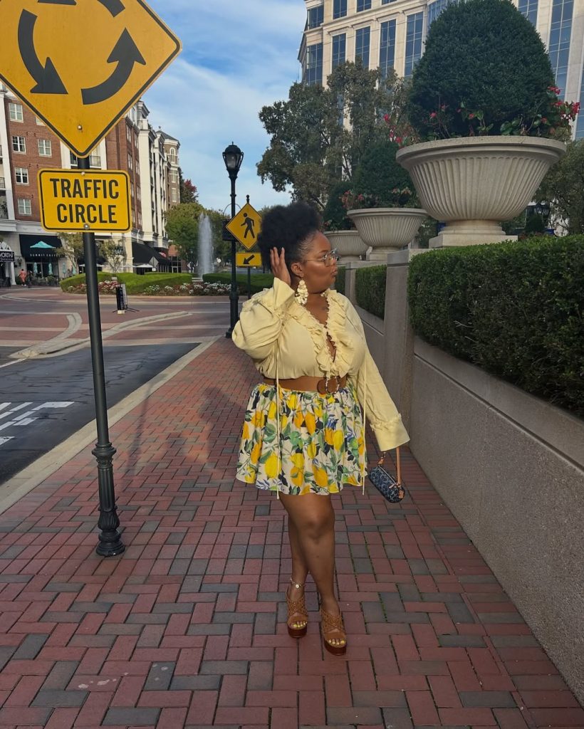 Ruffles, lemons, and warm neutrals come together in a joyful look that feels like golden hour in outfit form—perfect for summer night out plans.