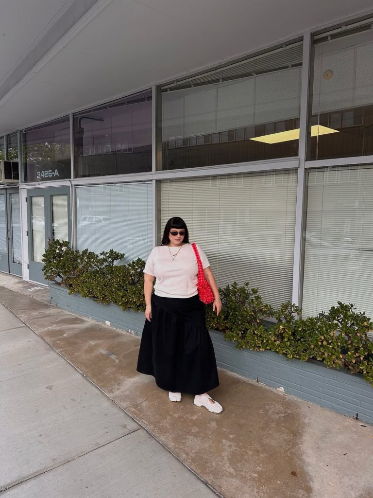 Think of this ensemble as your gallery-hopping uniform in Fall 2026 or an easy travel look that moves from airport to dinner for summer evenings. When temperatures dip, layer the outfit with a cropped leather jacket. Avoid tiny crossbody bags that can get lost against the skirt; instead, opt for an oversized tote to maintain intentional proportions and a fashion-editor chic look in your plus-size outfits for 2026.