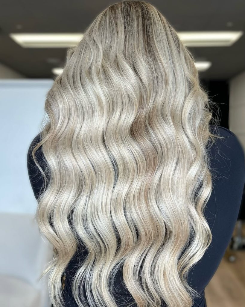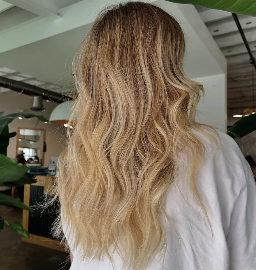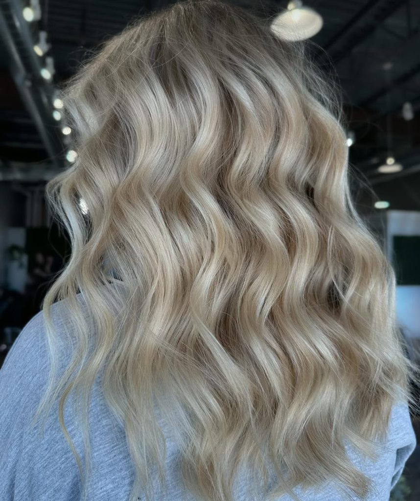 This look balances brightness and depth in a way that feels timeless. The slightly darker root melts into a luminous blonde mid-length, creating a natural transition that enhances texture and wave definition.