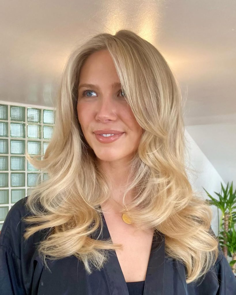 Waves return in a big way for Spring blonde hair 2026, but with intention. This look showcases Soft contrast rather than dramatic light-dark separation. The Balayage placement enhances texture, giving the blonde a relaxed, beach-adjacent feel without tipping into summer clichés. It’s ideal for Medium length hair, offering versatility for both air-dried days and polished styling. This blonde pairs especially well with casual layers—think lightweight knits, leather totes, and understated jewelry.