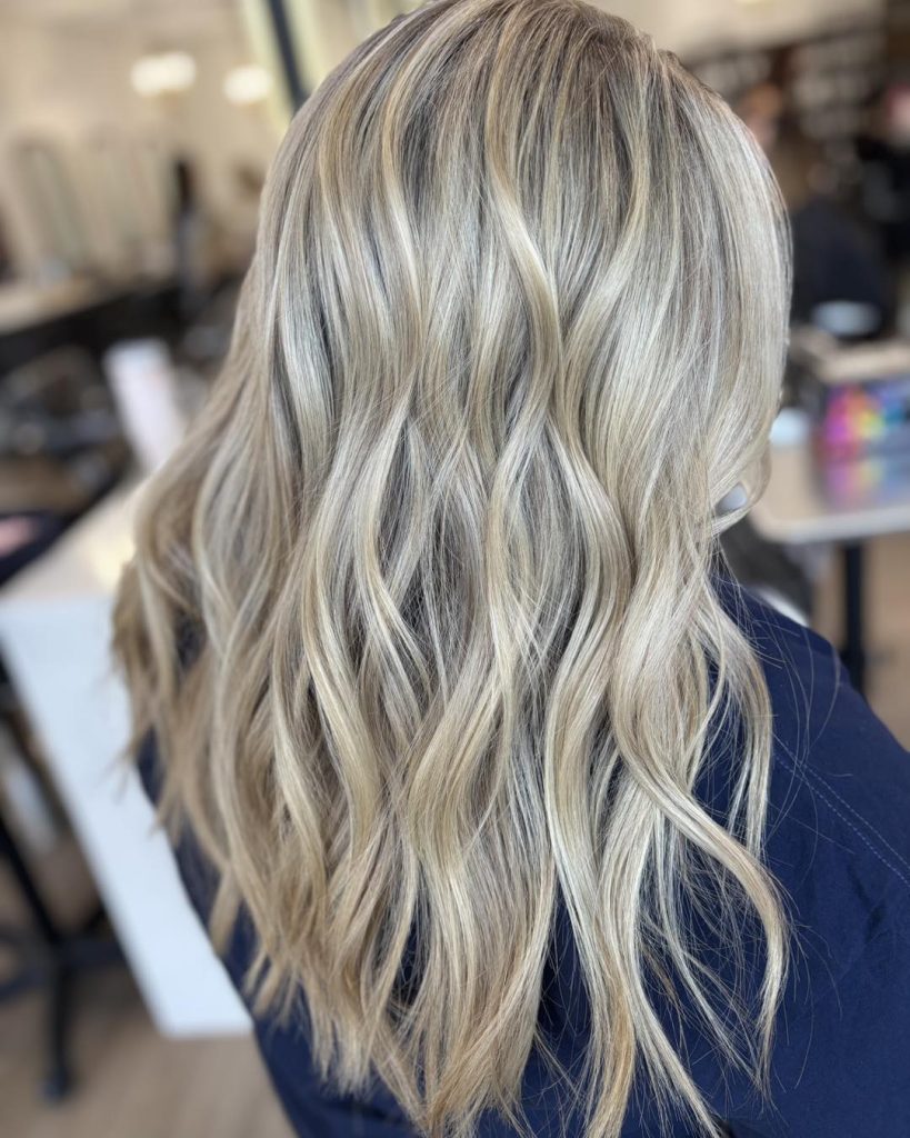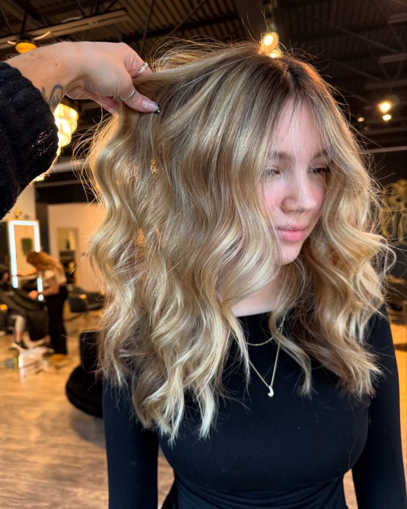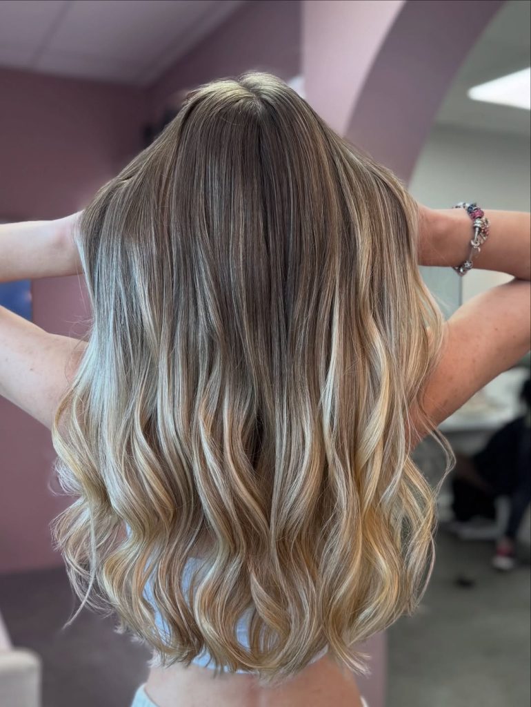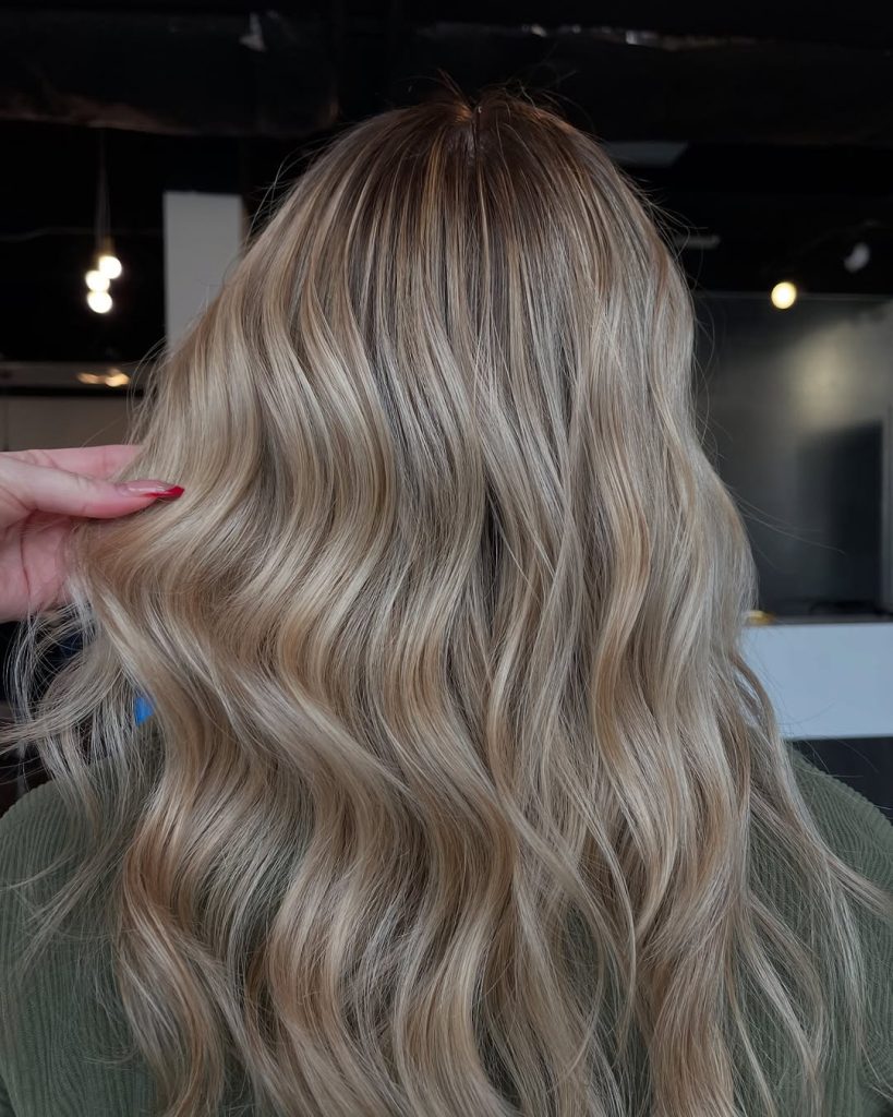 Here we see a classic spring refresh: lighter lengths paired with a softly shadowed root. The contrast is gentle, allowing the blonde to feel airy and fluid rather than dramatic. The waves are relaxed and slightly irregular, which enhances the natural feel of the Balayage. This is the kind of blonde that photographs beautifully in daylight and feels especially right for spring—fresh, approachable, and easy to live with.