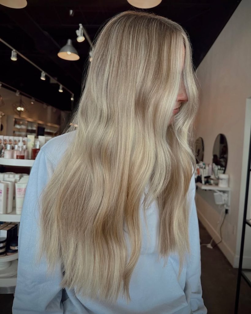 Length continues to matter in 2026, but it’s all about how color supports it. This long blonde look uses gentle highlight placement to maintain visual interest from root to ends.