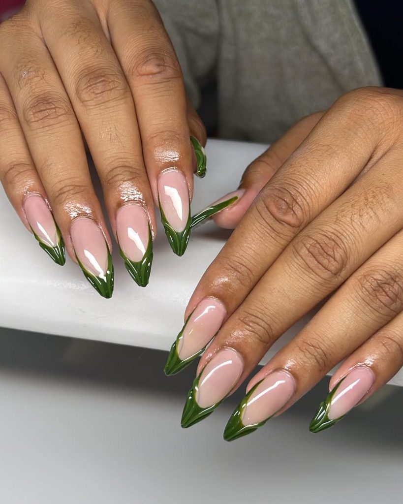 Inspired by nature, this manicure introduces a sculptural green tip that resembles fresh leaves curling upward. Set against a nude base, the design feels organic and artistic without being overdone. While not with flowers, it clearly nods to botanical themes that dominate spring ideas year after year. This look pairs beautifully with natural fabrics and neutral wardrobes, offering a subtle statement that feels thoughtful and modern.
