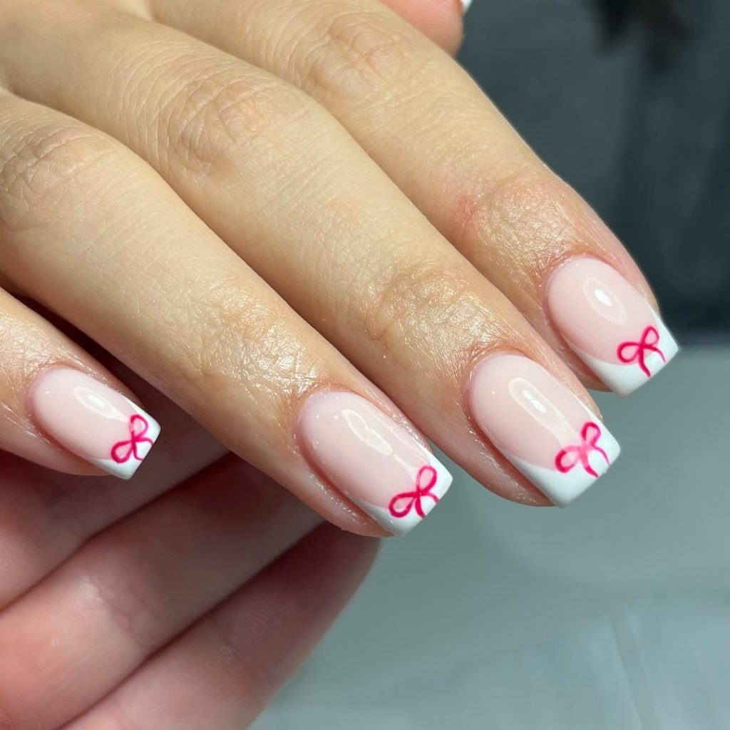Minimal White French Tips With Pink Ribbon Accents
