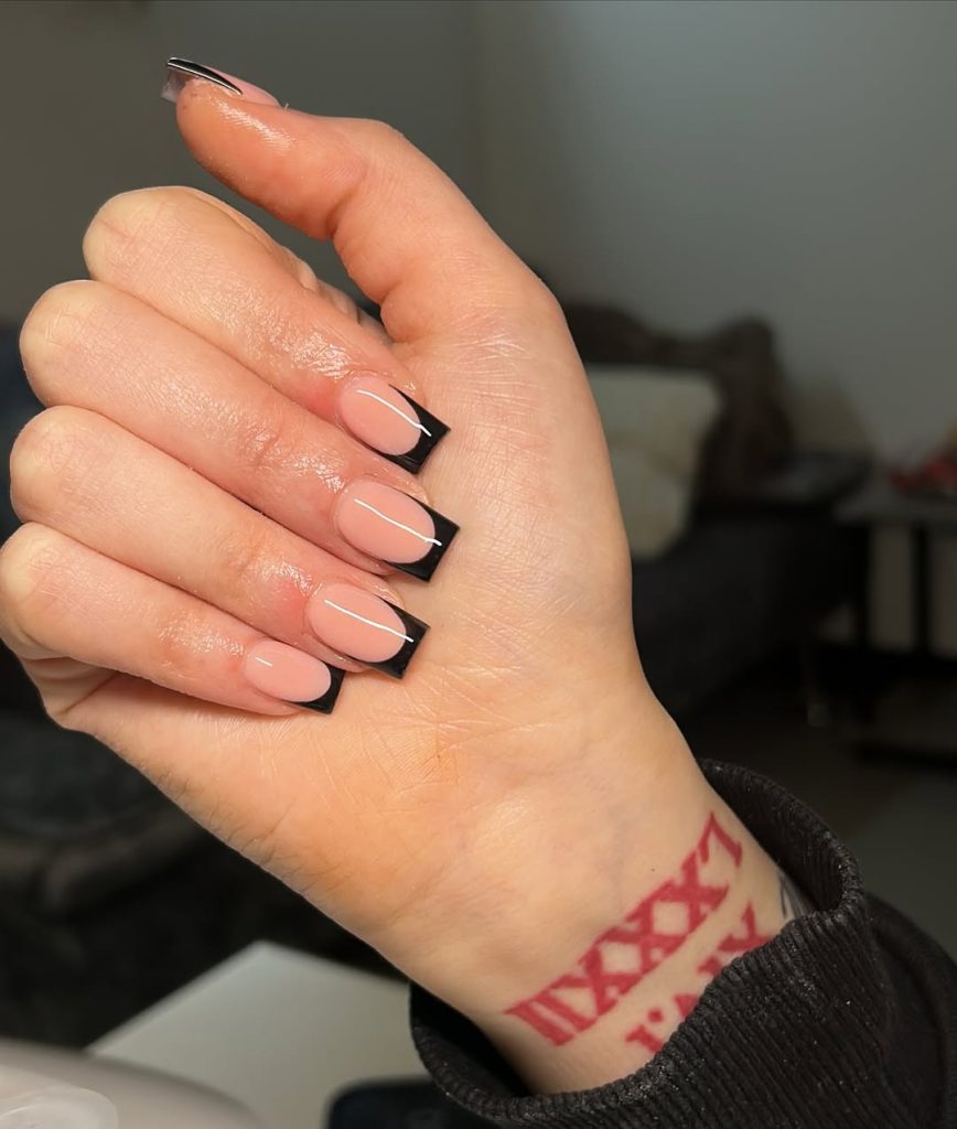 This design leans into contrast in the most confident way. A warm nude base meets sharp black French tips, creating a high-impact look that still feels intentional. The square shape adds structure, while the glossy finish keeps it refined rather than edgy. This manicure works especially well for women who favor monochrome wardrobes or statement accessories. It’s proof that French tip designs don’t have to be delicate to feel current in 2026.