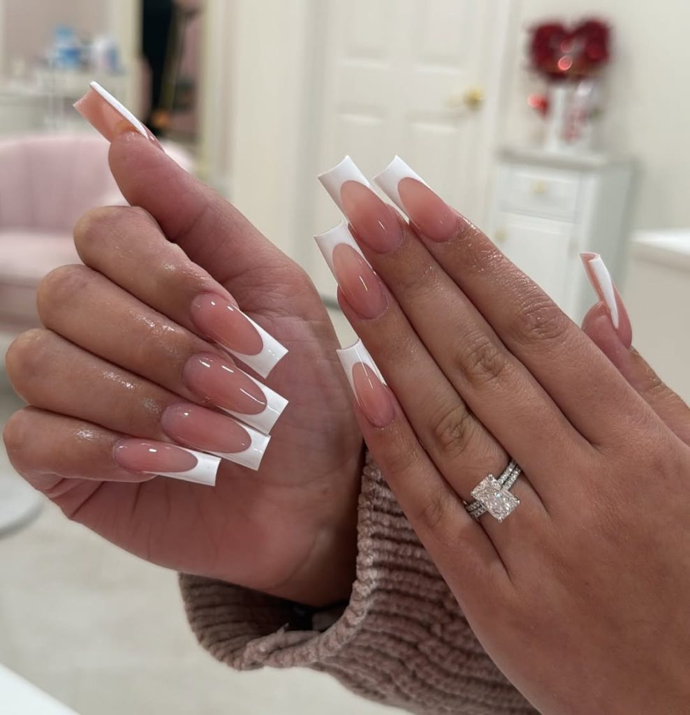 Here, traditional French tips are elevated through length and precision. The glossy nude base paired with sharp white edges creates a clean, sculpted look that feels luxurious without excess. While longer than square short, this style still reads timeless rather than trendy. It’s a favorite among brides and women who love polished beauty moments. The manicure pairs beautifully with neutral outfits, soft knits, and tailored pieces.