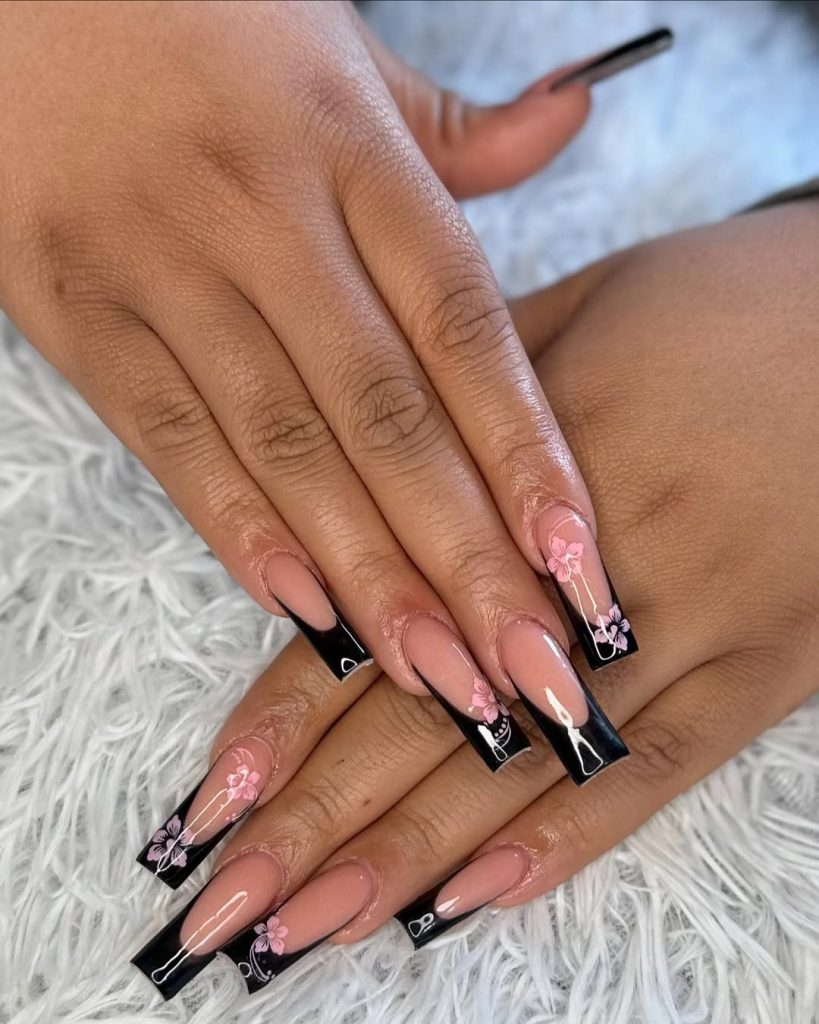 Floral accents bring this manicure to life without overpowering it. A glossy nude base anchors bold black square French tips, while delicate pink flowers soften the contrast. This design works beautifully with flowers placed selectively, keeping the look balanced rather than busy. It’s a smart choice for women who enjoy statement nails but still want cohesion and elegance. Think spring events, special occasions, or moments when you want your nails to feel intentional and expressive.