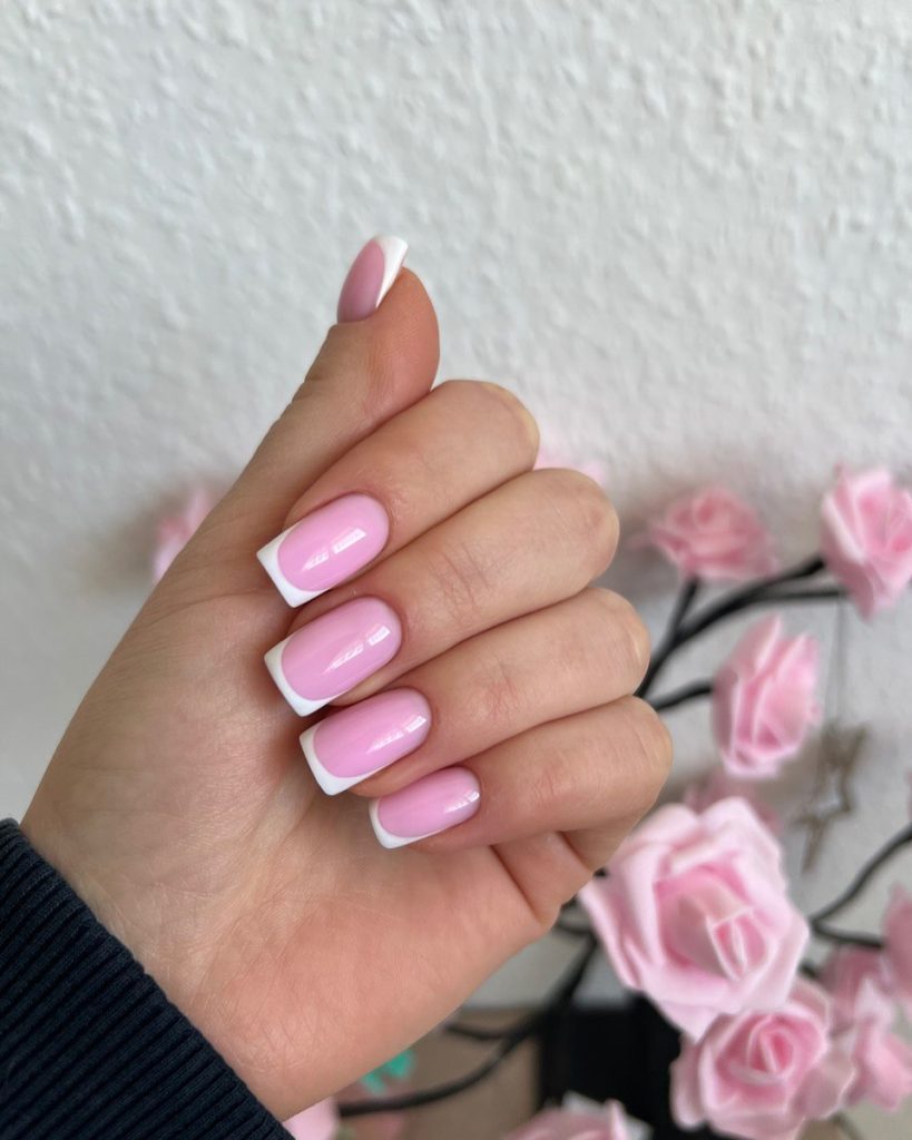 This manicure highlights how effective simplicity can be. A creamy pink base paired with neatly defined white French tips creates a clean, balanced look. The square shape adds a modern edge, while the glossy topcoat enhances the softness of the color. This style feels especially practical for everyday wear — professional, polished, and timeless. It’s the kind of manicure that works seamlessly with neutral wardrobes and relaxed spring styling.