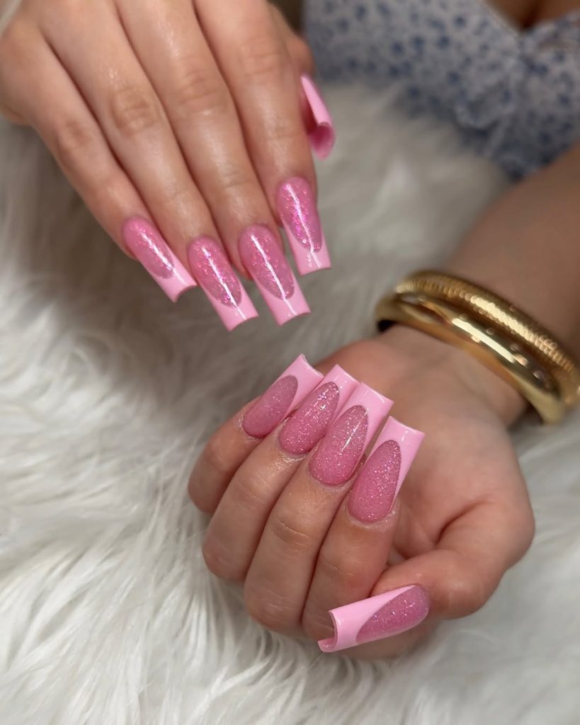 These coffin-shaped French tips lean into subtle glamour. A semi-transparent pink base is layered with fine shimmer, catching the light with every movement, while pale pink tips keep the look cohesive. This design feels perfect for women who want something elegant but not overly bold. The sparkle is refined rather than flashy, making it ideal for spring evenings, events, or polished everyday looks. It’s a great example of how French tips in 2026 are embracing soft shine instead of heavy embellishment.
