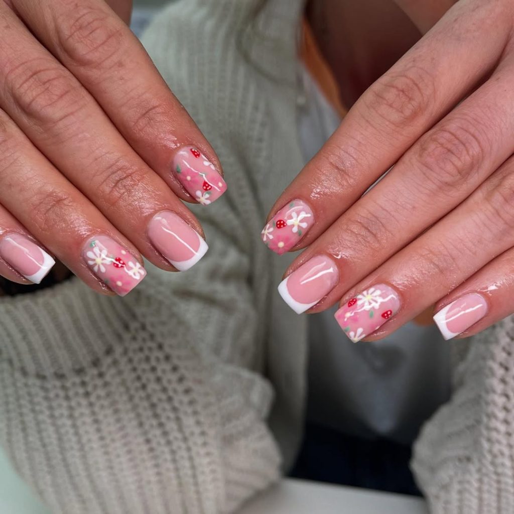 This look captures the heart of Square 2026 nail trends with a gentle, romantic twist. The base is a soft blush pink that feels fresh and clean, paired with crisp white French tips that keep the design grounded in tradition. What elevates it for spring is the delicate floral artwork layered across select nails—tiny white daisies accented with miniature red details that bring personality without overwhelming the design. This is a perfect example of Square short nails done right: practical, polished, and quietly playful.