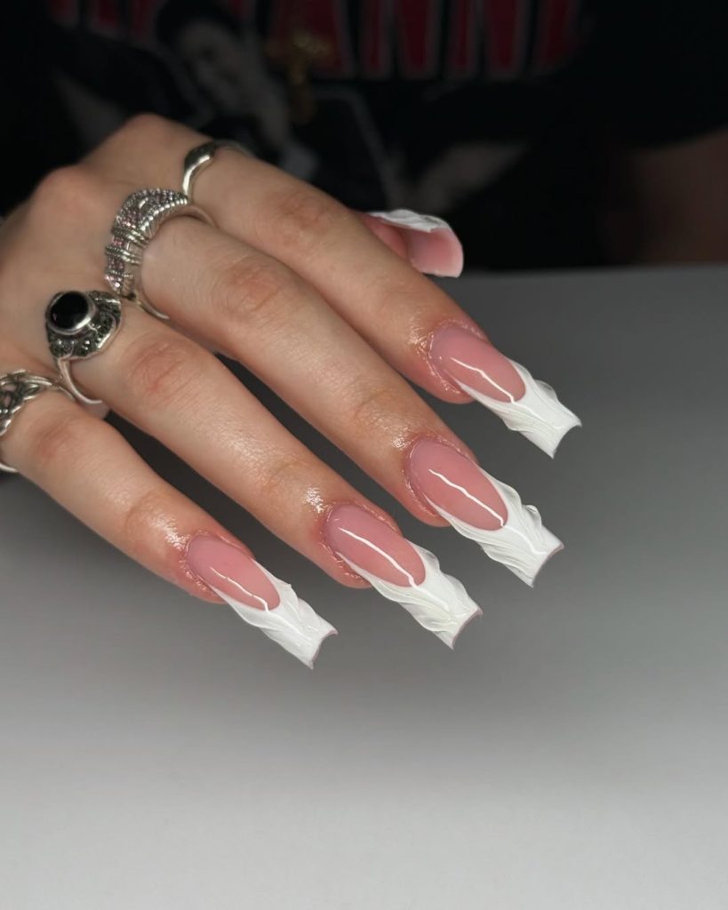 Here, the French tip becomes the focal point. Instead of a flat white edge, the tips are sculpted with a raised, flowing texture that adds dimension and artistry. Set against a nude-pink base, the design feels modern and high-fashion without losing elegance. This manicure is ideal for women who enjoy creative details while staying within a neutral palette. It reflects the Spring 2026 trend toward subtle 3D elements that feel intentional rather than decorative.
