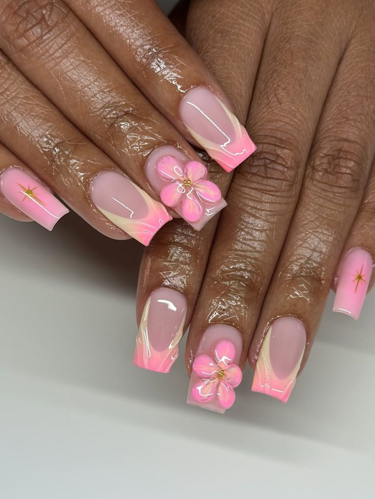 Pink Ombre French Tips With Floral Accent