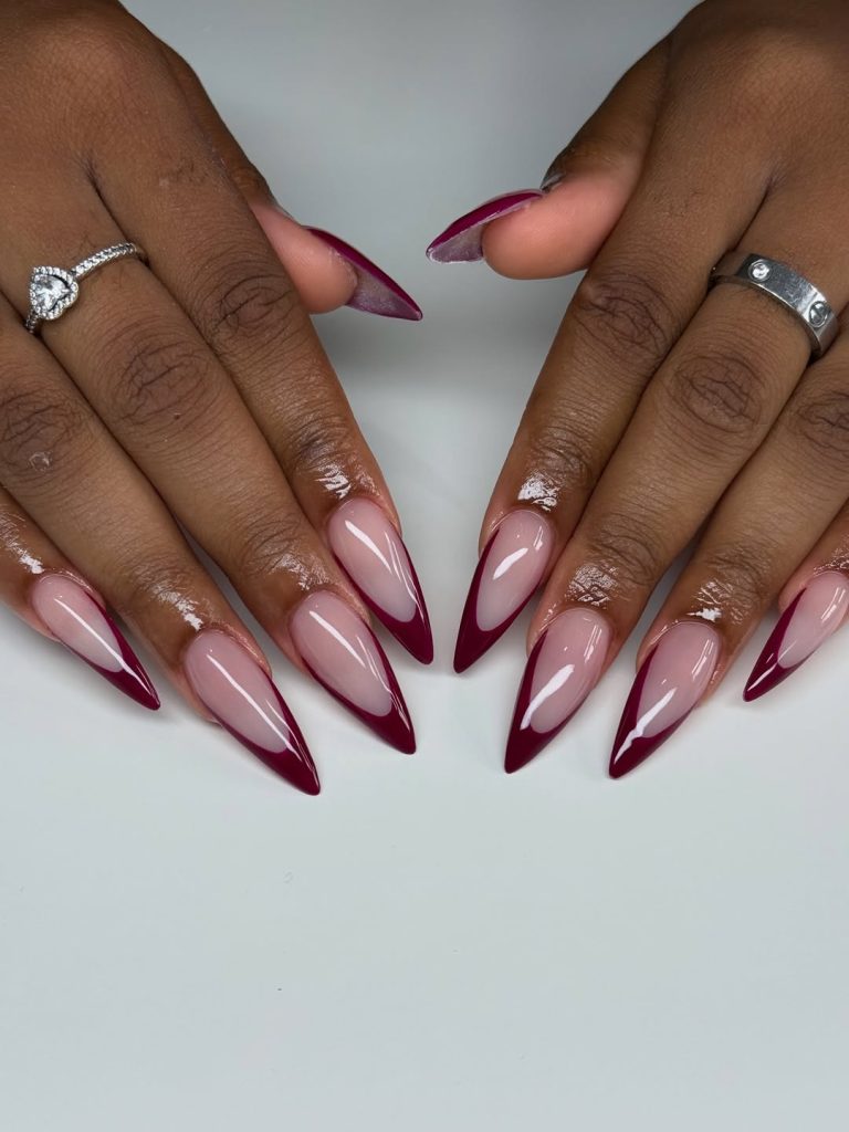Burgundy Stiletto French Tips With Sharp Contrast