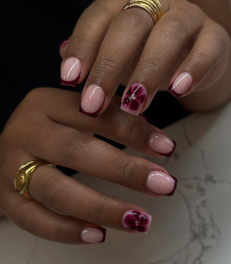 Here, deep burgundy tips are softened by a blush-pink base and delicate floral nail art. The short square shape keeps the manicure wearable and practical, while the accent flowers add personality without overwhelming the design. This look feels romantic and thoughtful — a great choice for spring occasions when you want something special but not flashy. The balance between dark tips and soft detailing reflects how French nails are evolving toward expressive minimalism.