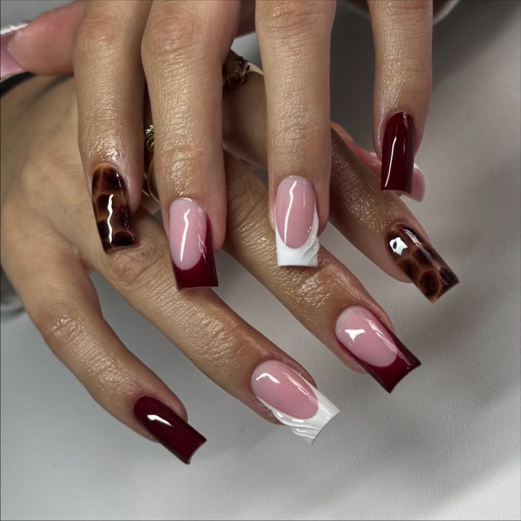 This creative set blends multiple French tip variations into one cohesive look. Burgundy tips, crisp white accents, and tortoiseshell nail art coexist without feeling busy. The neutral pink base ties everything together, allowing each design element to stand out individually. This manicure is perfect for women who enjoy variety and artistic expression while still staying within a controlled color palette. It feels modern, confident, and thoughtfully styled.