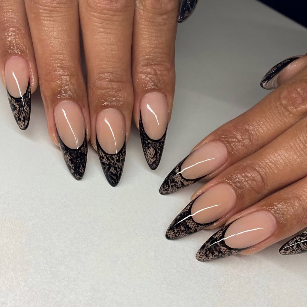 Lace-Inspired Black French Tips on Almond Nails