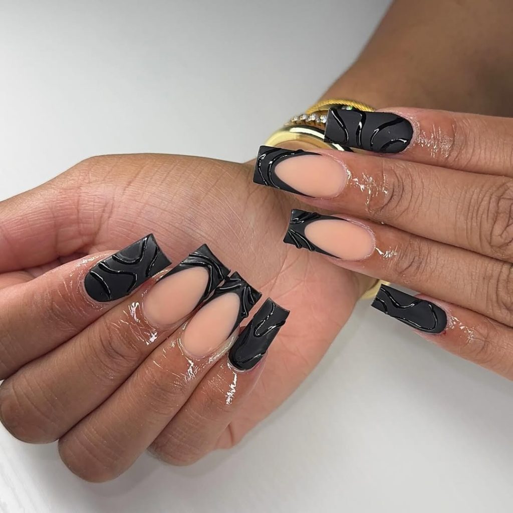 This high-fashion manicure turns the French tip into a sculptural statement. Glossy black tips are raised and contoured, creating a striking 3D effect against a nude base. The square shape adds strength to the design, while the smooth curves keep it modern rather than harsh. This look is ideal for women who love avant-garde beauty and want their nails to feel like wearable art. It perfectly captures the experimental edge emerging in Spring 2026 nail trends.