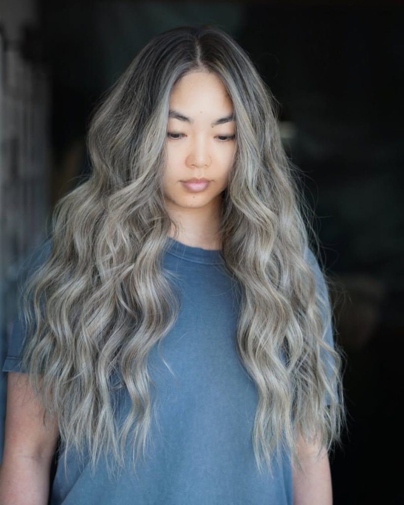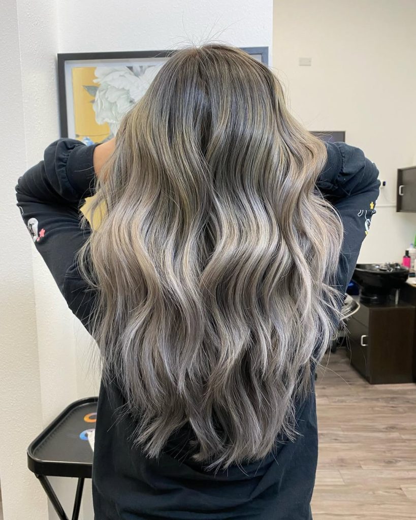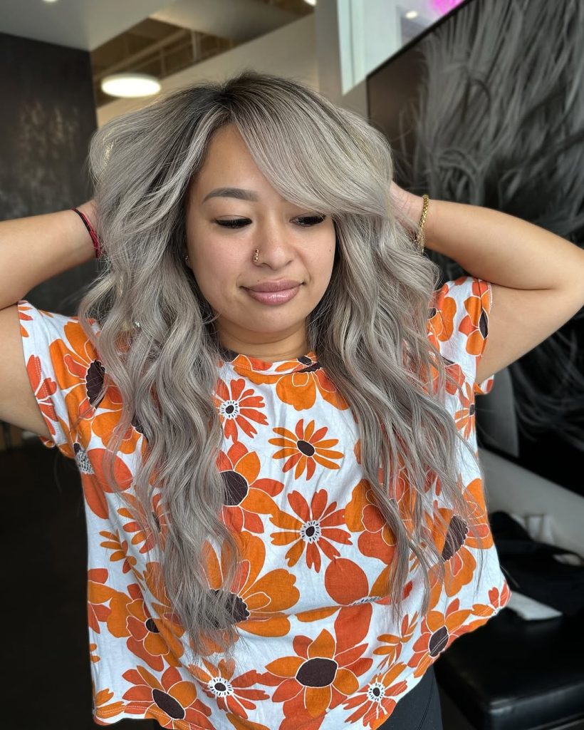 This is the head-turning version of ash: long, cascading waves in a silvery, smoke-leaning blonde that stays firmly on the cool side. The root depth keeps the overall effect believable, while the lengths have that soft silver sheen that looks luxe even with minimal styling.