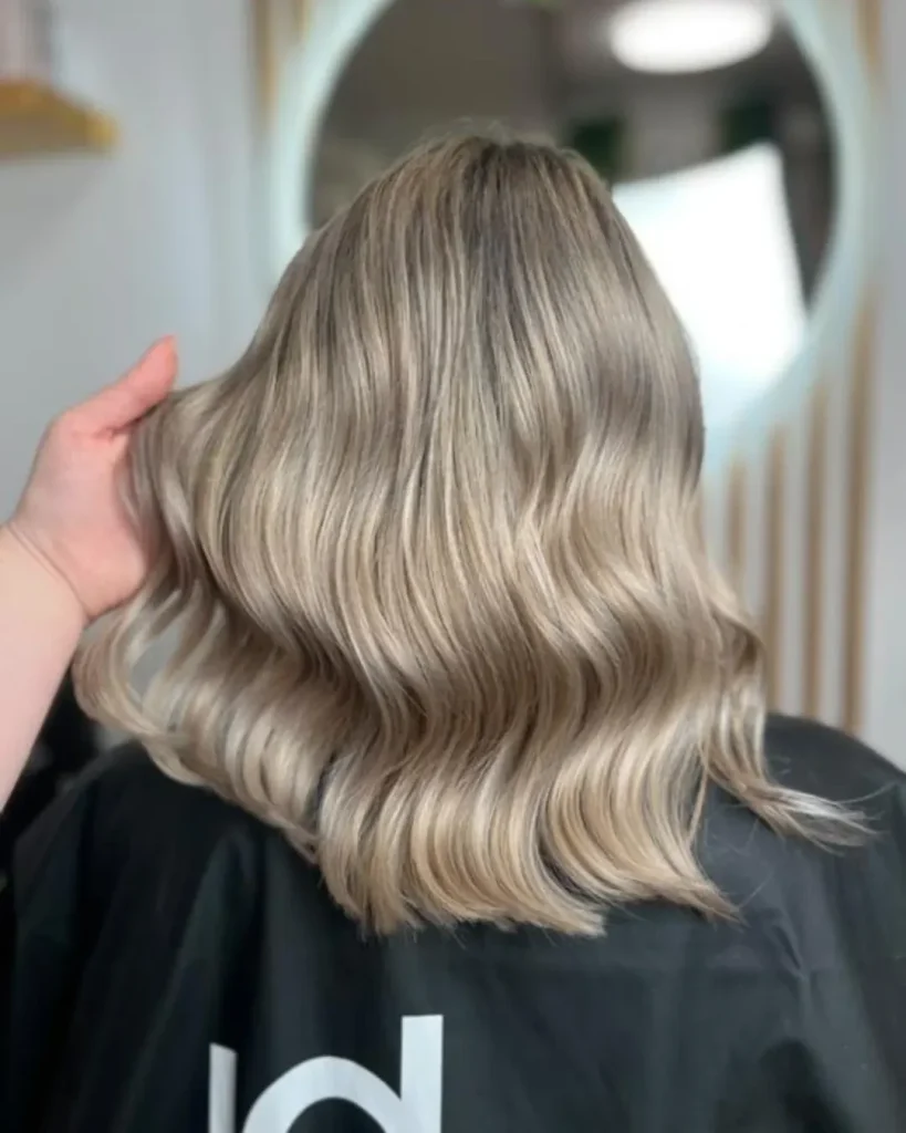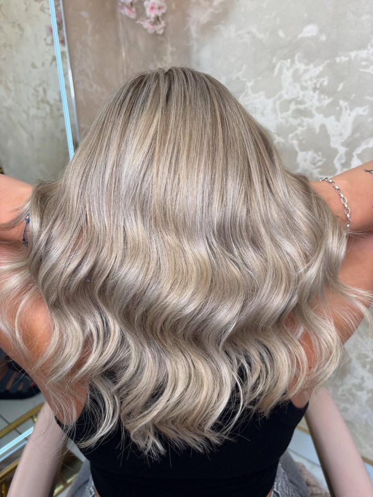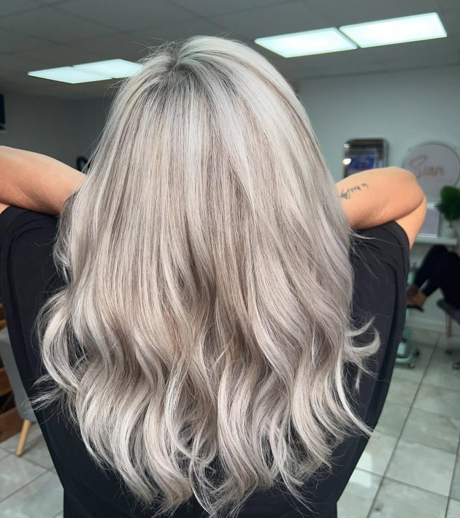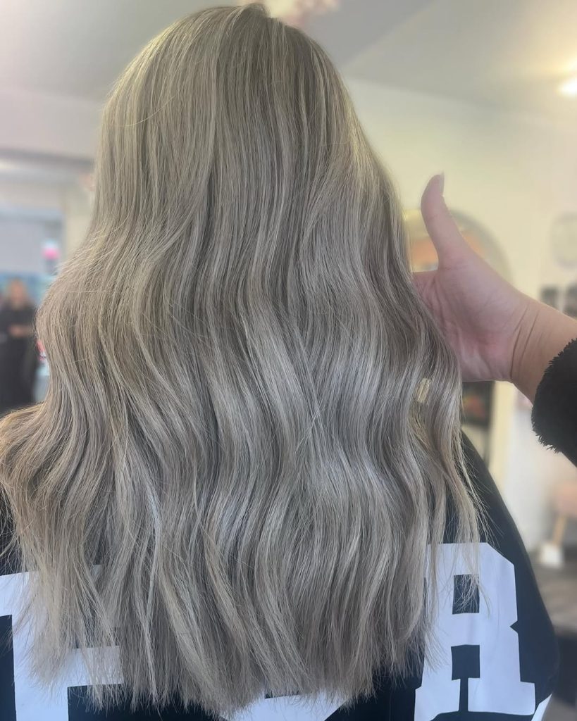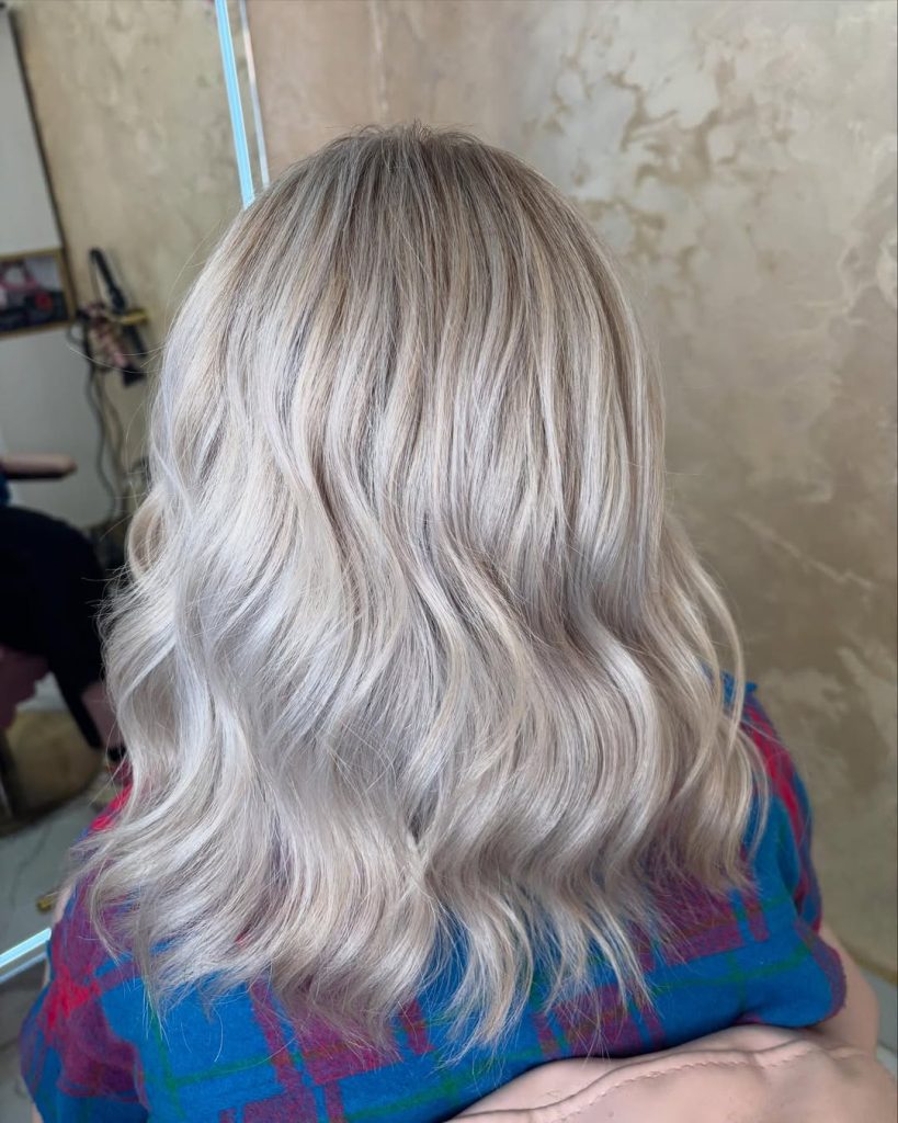 The standout detail here is the tone: it’s not pure silver, and it’s not warm honey. It’s a creamy ash that sits perfectly in beige balayage territory—ideal if you want a cool result but worry that full-on gray will wash you out. It’s also a perfect choice if you’re transitioning from warmer blonde and want to cool down gradually.