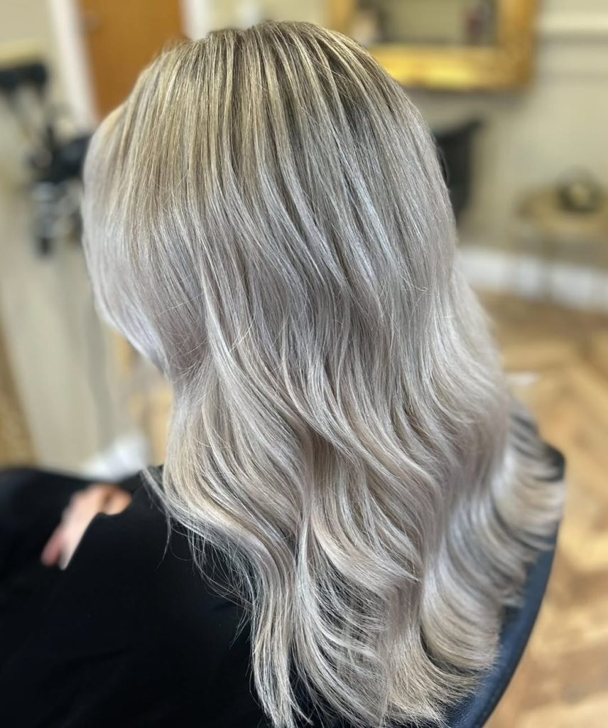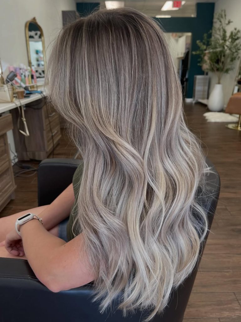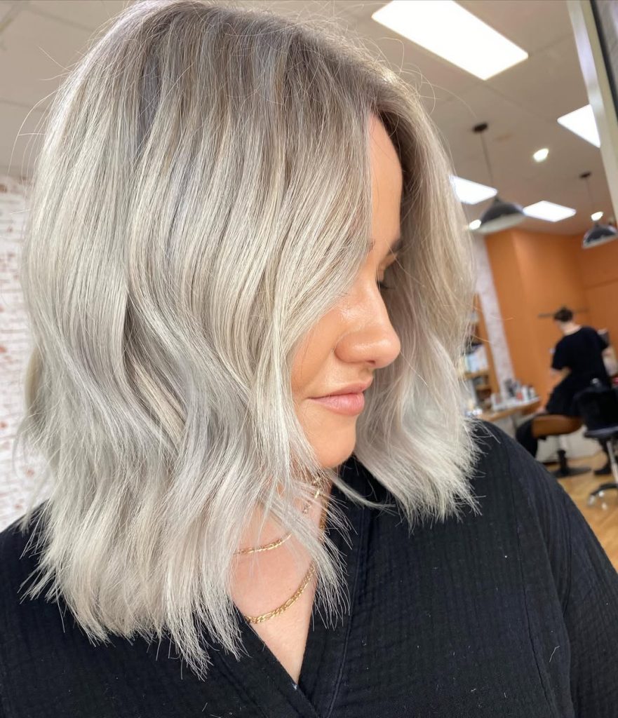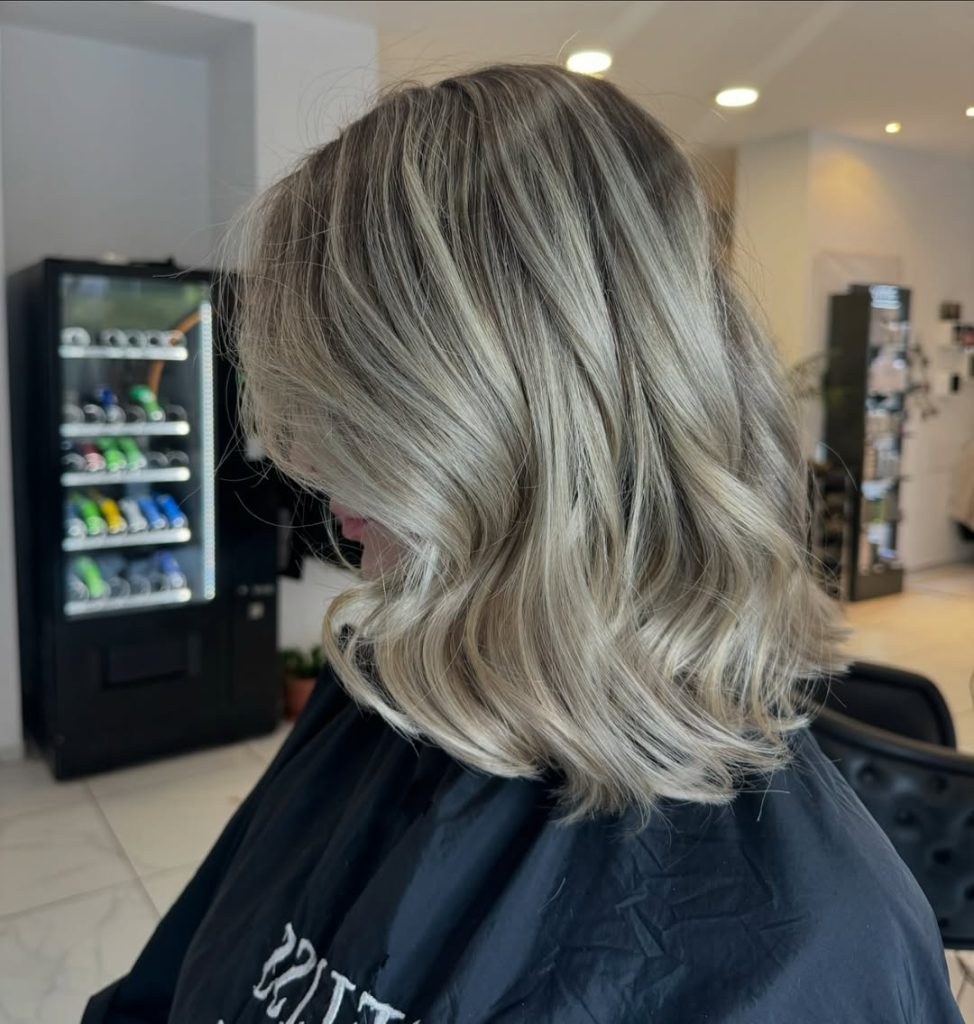 The standout detail here is the tone: it’s not pure silver, and it’s not warm honey. It’s a creamy ash that sits perfectly in beige balayage territory—ideal if you want a cool result but worry that full-on gray will wash you out. It’s also a perfect choice if you’re transitioning from warmer blonde and want to cool down gradually.