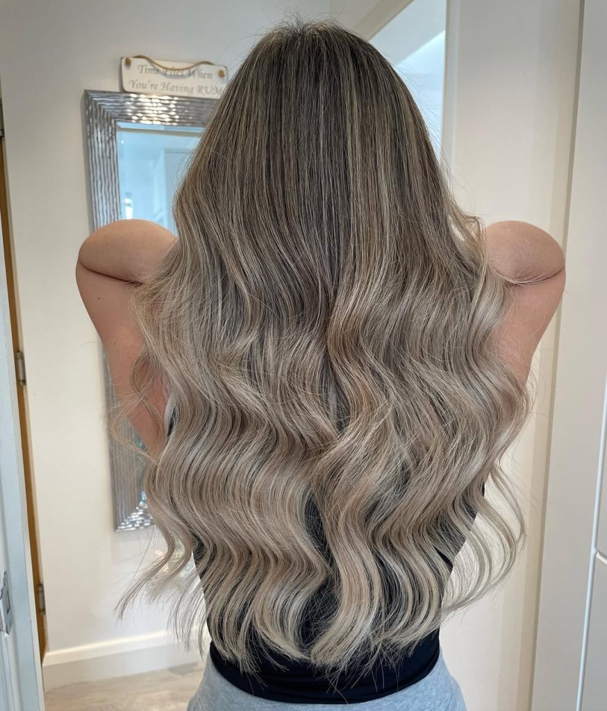 Smoky ash blonde balayage with lived-in contrast and soft waves