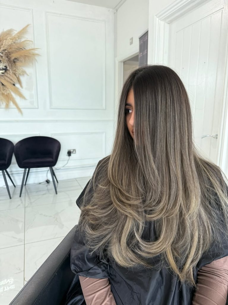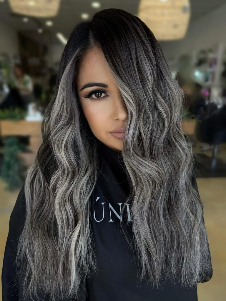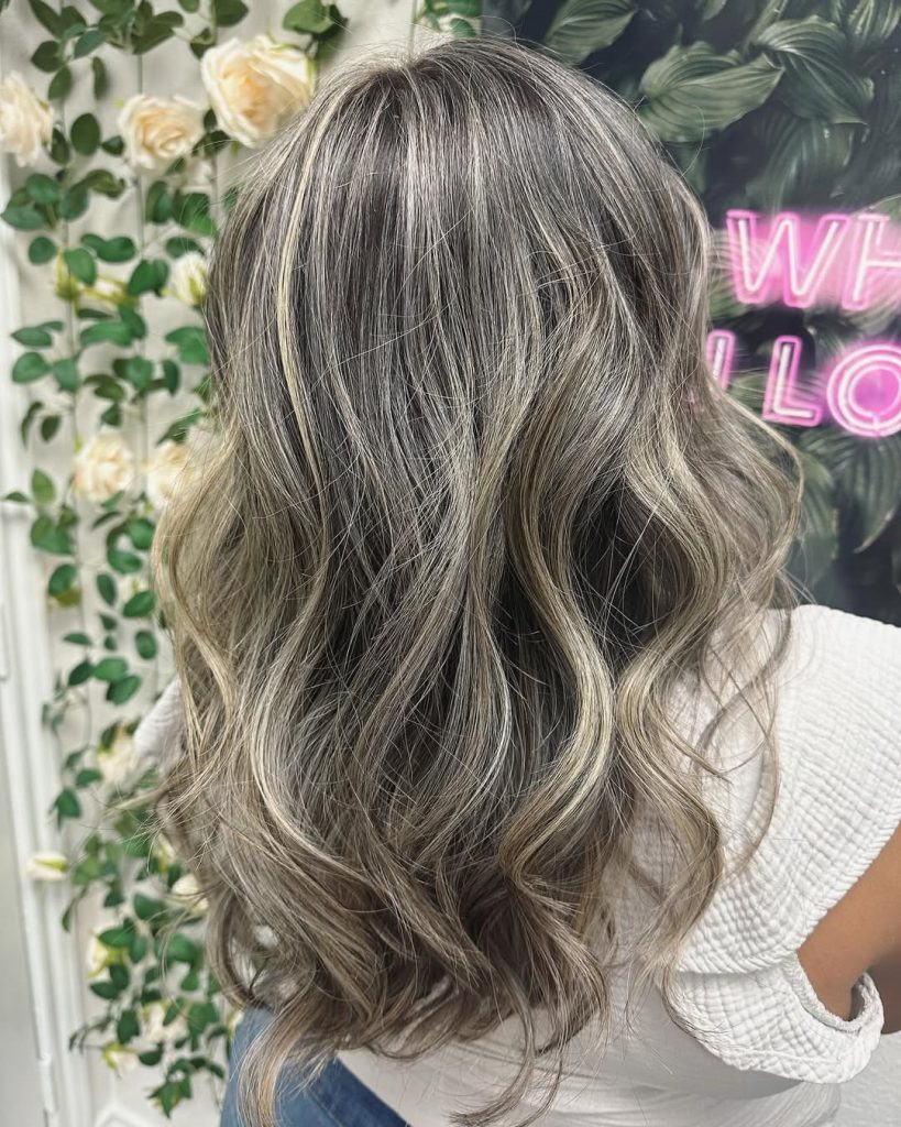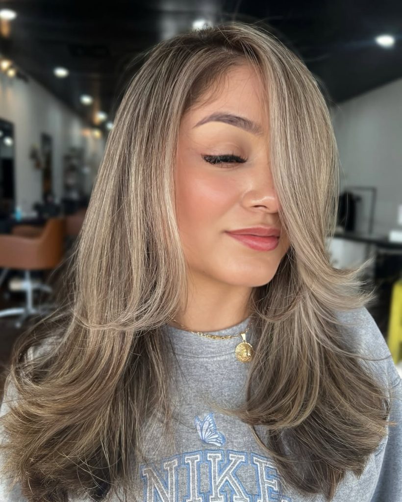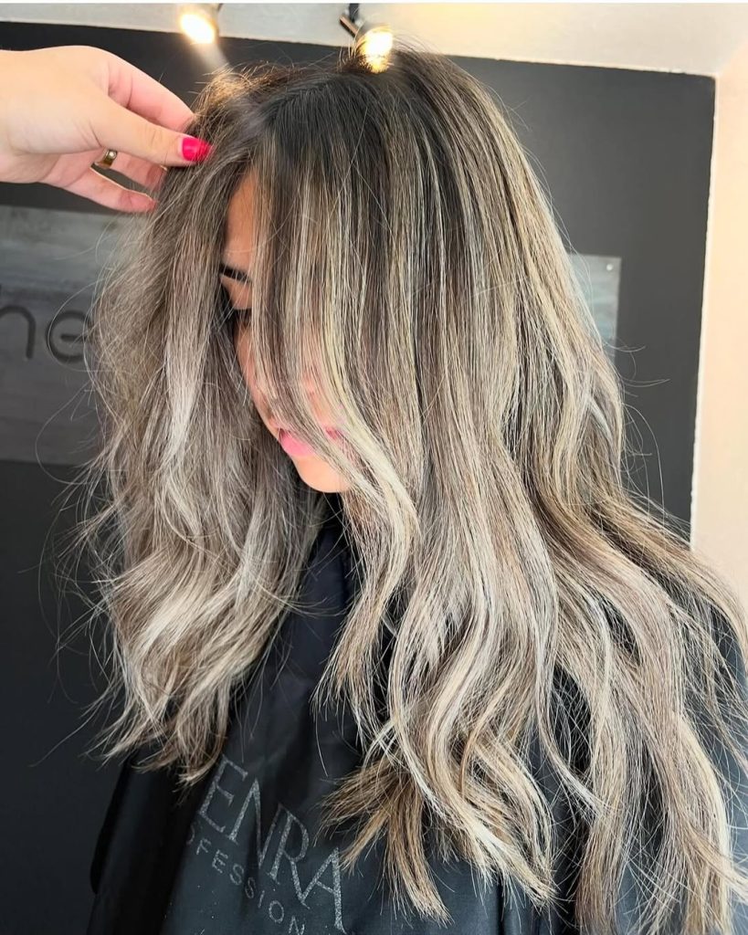This look is for the woman who wants to be “blonder,” but not in a way that takes over her whole identity. The base stays deep and rich, and the ash comes in like soft smoke—subtle through the mid-lengths, brighter at the ends, and perfectly married to long, flowing layers. It’s the kind of color that looks believable in real life and still photographs beautifully.