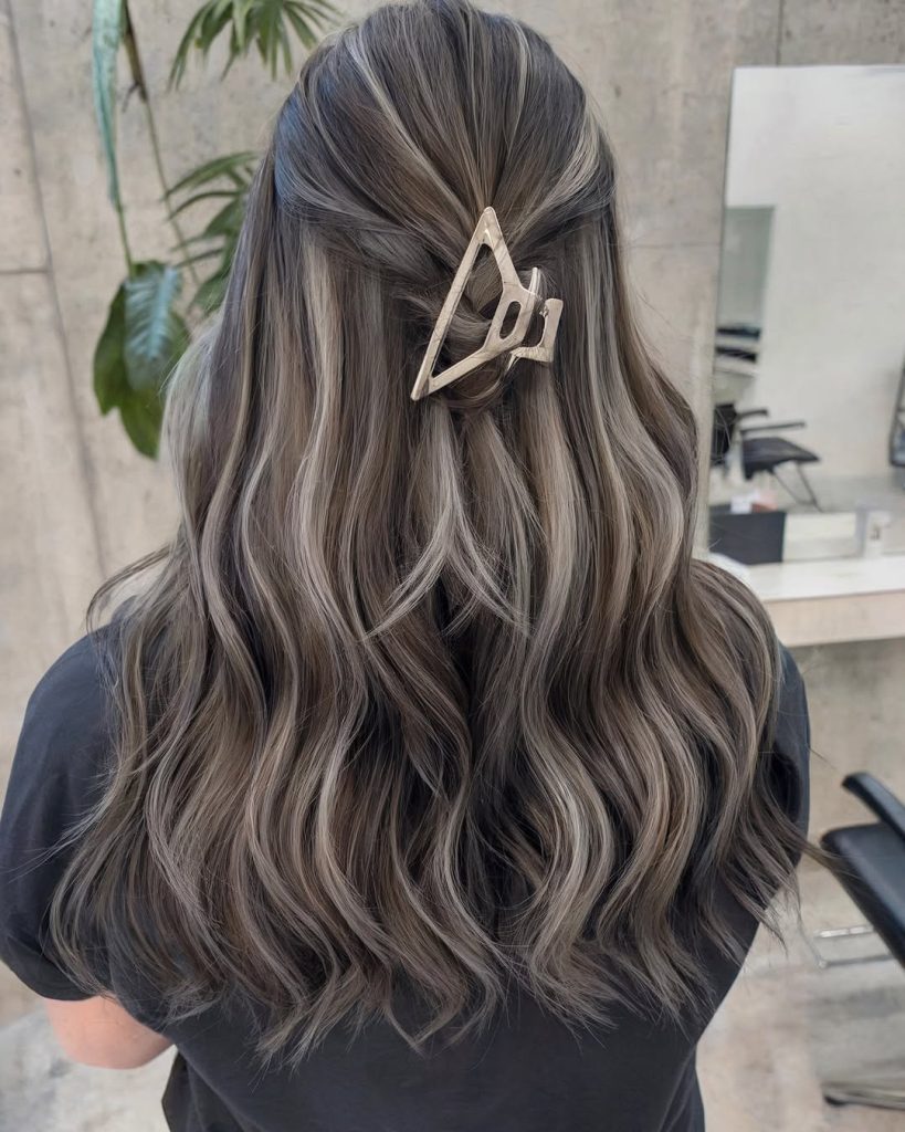 This style works especially well if you want impact without committing to full blonde. Tell your colorist you want ideas with lowlights with a money piece so the interior stays rich and the lighter pieces don’t take over. The tone here leans graphite-ash, living comfortably between grey and silver without going flat.