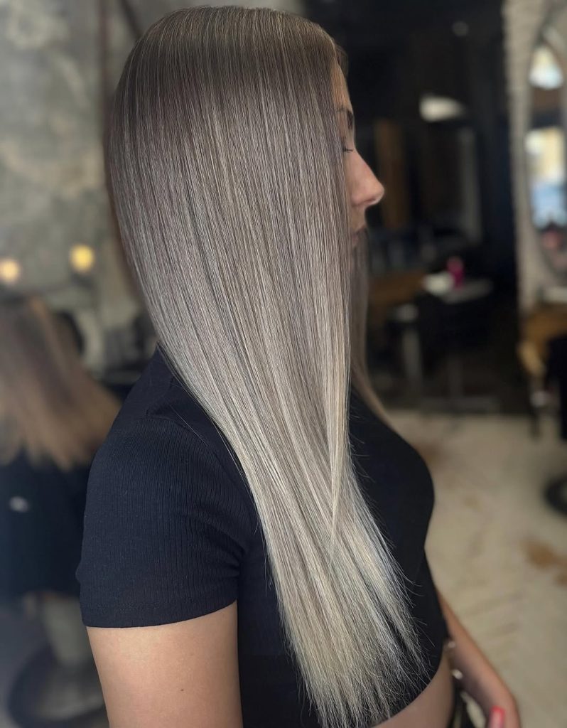 This one is pure fashion-week energy. Ultra-straight, glassy hair shows a dramatic gradient: deeper at the crown, then fading into a clean, silver ash through the ends. It’s crisp, editorial, and undeniably modern—especially for anyone who loves minimalist outfits and sharp silhouettes.