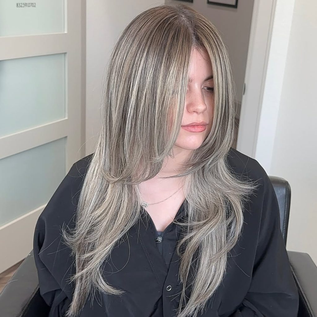 This look is what happens when ash blonde grows up and gets a blowout. Long, feathered layers create movement through the ends, and the color sits in a sophisticated, smoky grey-ash family that feels very 2026. The tone is cool and modern but still wearable—more “downtown editor” than “costume silver.” What really elevates it is the face-framing brightness: highlights that pull forward and brighten around the cheekbones without turning into harsh stripes.