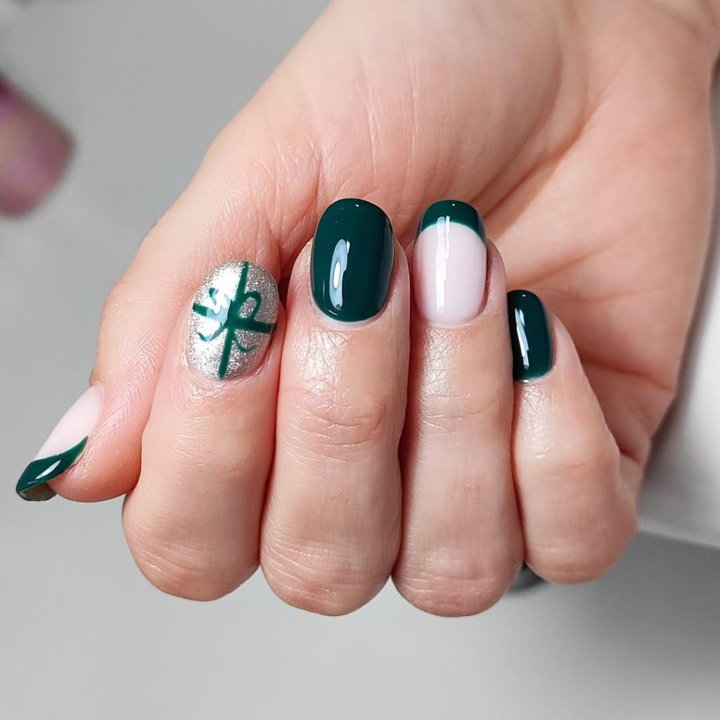 The combination of a deep evergreen manicure showcases full-coverage glossy nails with neat half-moons and the sole “present-wrap” bow resting on a silver foil accent. The junction of Green and the metallic is not loud but luxurious, and the negative space is what makes it easy-going and breathable through the hectic weeks.