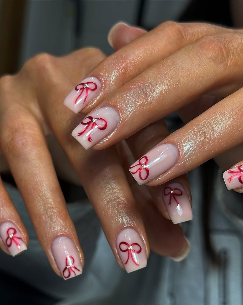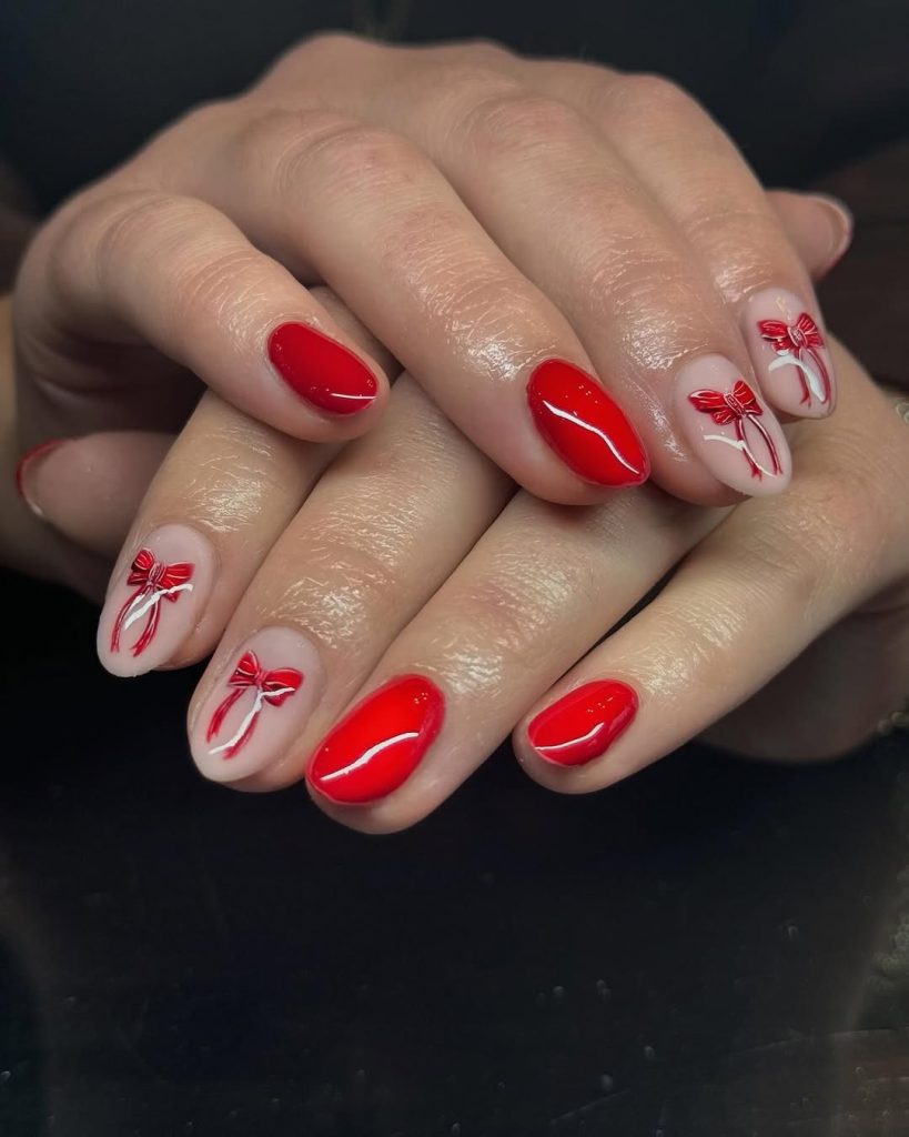 High-gloss Red nails alternate with sheer nude bases topped by tiny hand-painted bows. The ribbon tails add movement that feels flirty and Cute —perfect when your December calendar includes date nights and cookie swaps.