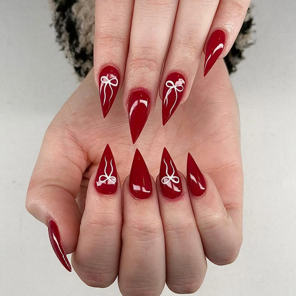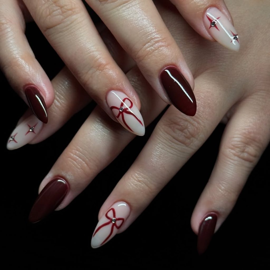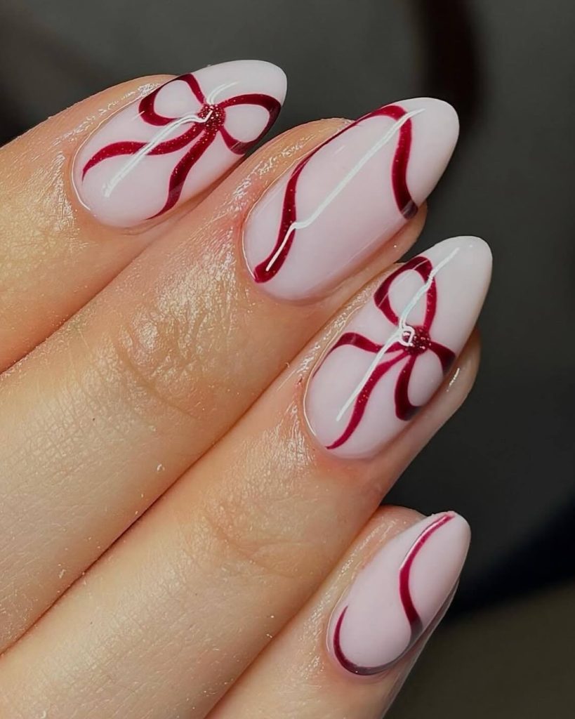 A blush base becomes a present: sweeping crimson lines “wrap” each nail, finishing in bold ribbon knots that sit just off-center. The elongated Almond shape sells the elegance.
