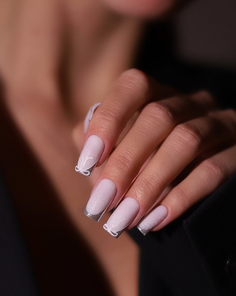 Think “Snow Queen” but office-appropriate: soft shell- Pink base, frosty silver French tip , and micro bows drawn at the free edge. The squared silhouette is modern yet delicate.