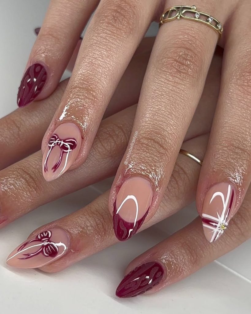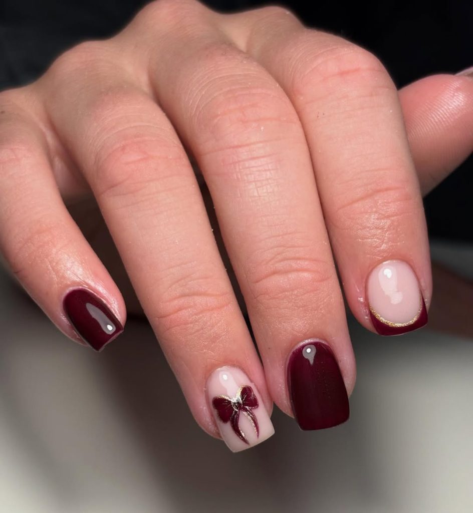 Deep merlot blocks pair with ballet-slipper nude, then a single bow is edged in Gold and set against a glossy wine base. Another nail carries a micro French in metallic—tiny detail, big payoff.