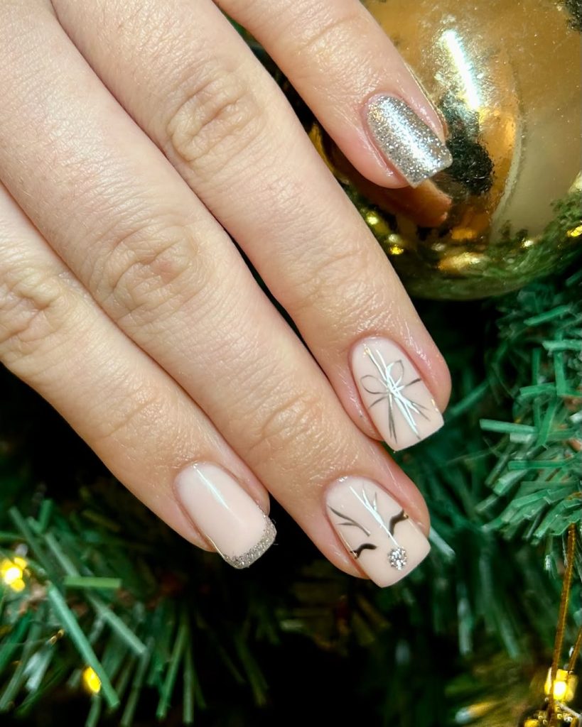 Neutral nude squares are punctuated by a full-glitter champagne nail and fine white ribbons, plus a single crystal “ornament.” It’s polished enough for boardrooms and bright enough for tree-lighting photos.