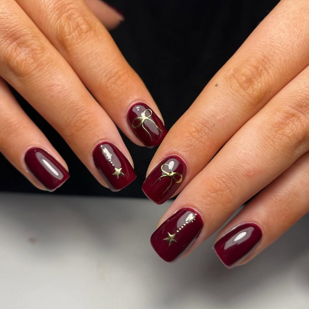 A sumptuous cabernet base gets tiny metallic bows and star studs that read like jewelry on the nails. The squared silhouette keeps the Design sharp and modern, while the warm sheen of Gold softens the depth of the color—holiday glamour without glitter fallout.