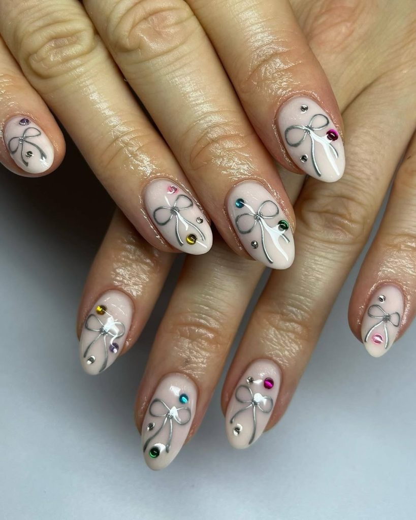Why it works: The neutral base flatters every skin tone and the bow linework stays Simple and chic, so the gems can shine.