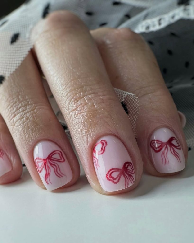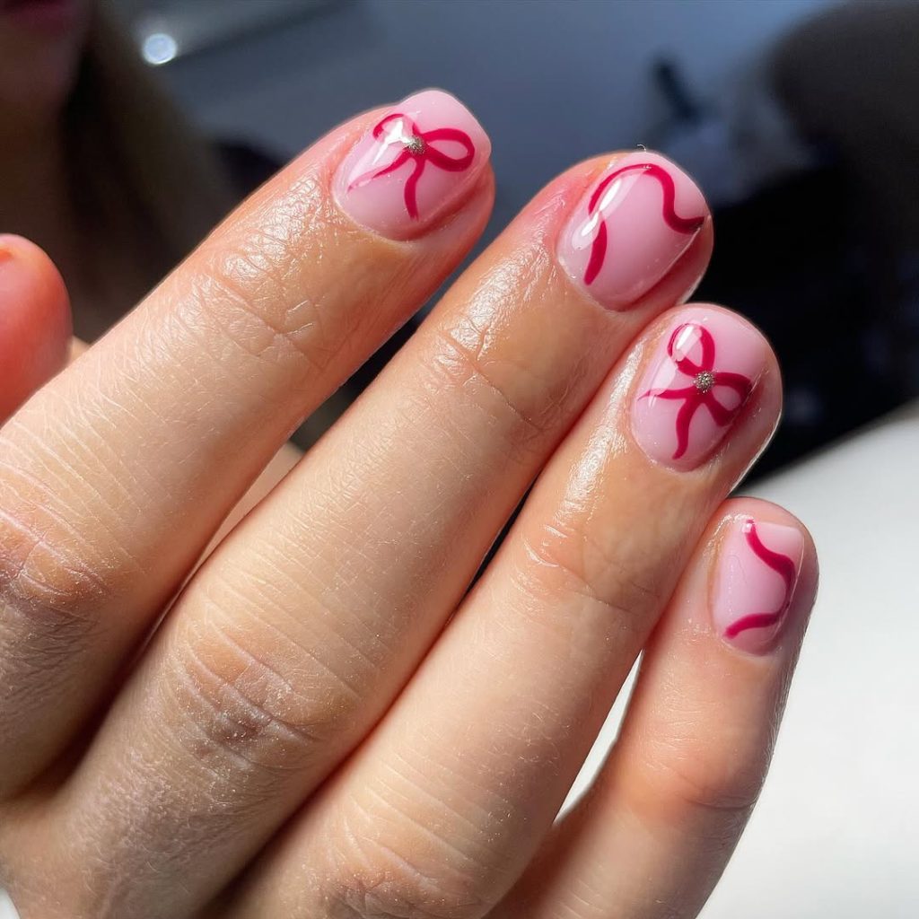 Soft Pink sheer nails get hand-drawn ribbon silhouettes in cherry Red . The sketchy tails add movement and keep things lighthearted—think balletcore meets candy-cane.