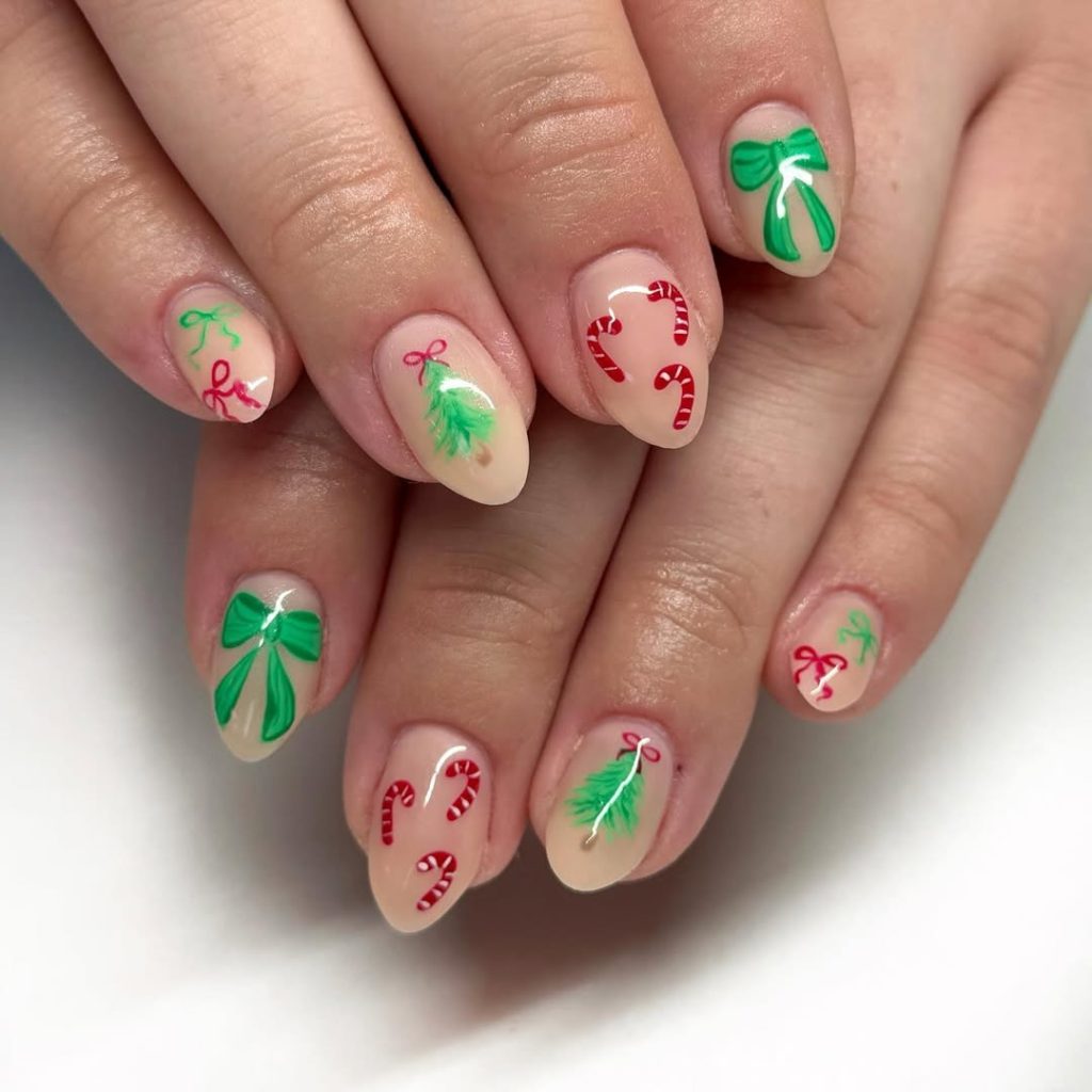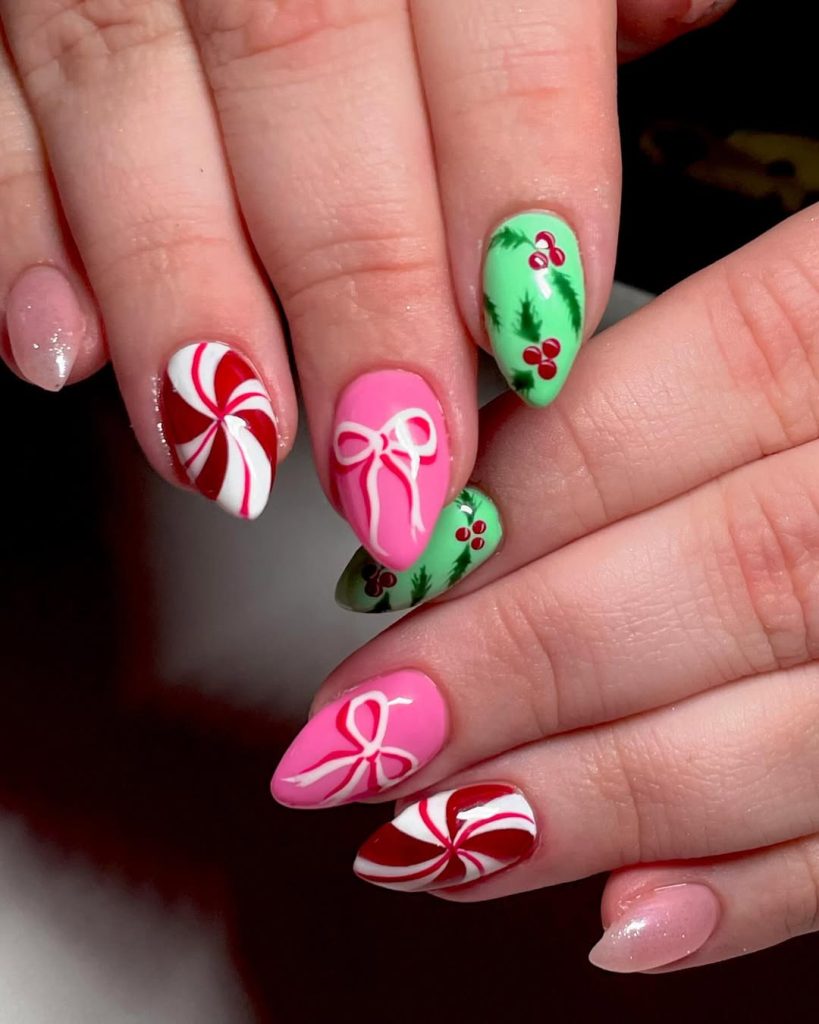 If your holiday mood board swings playful, this set blends candy-shop stripes, holly sprigs, and ribbon loops across glossy almonds. Bubble Pink nails carry hand-drawn bows, while Red -and-white peppermint swirls balance two soft-matte Green nails dotted with berries. The varied motifs keep the Art lively, yet the unified palette ties everything together.