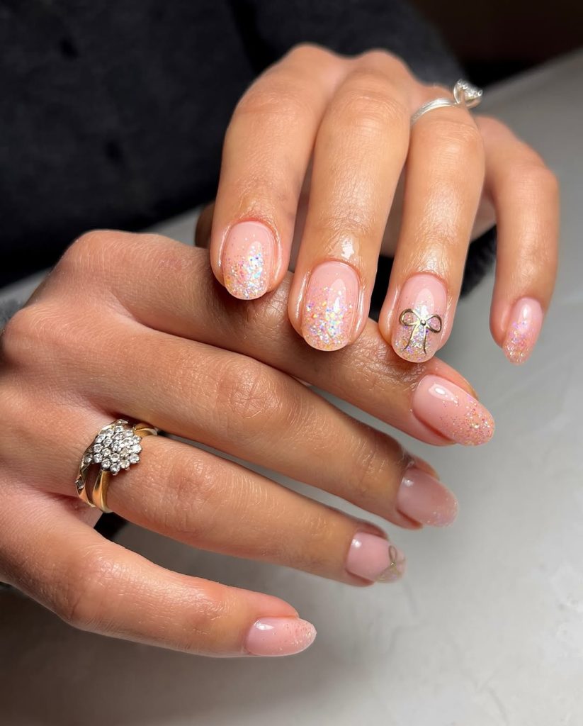 Why it works: The mix of sheer coverage, glitter, and restrained bow Art feels balanced and wearable.