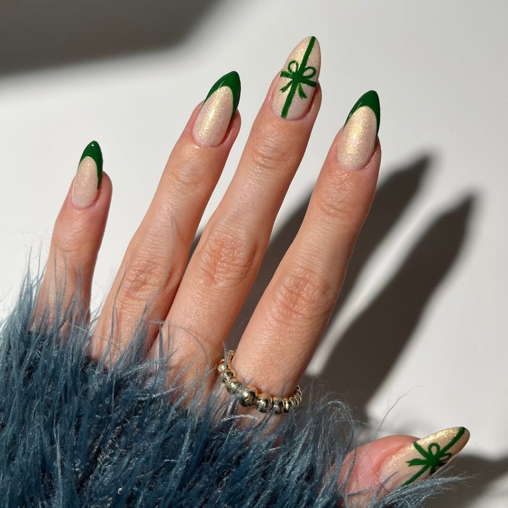 Think present-perfect packaging: a soft gold shimmer base with deep Green framing and one vertical ribbon ending in a neat bow. The elongated Almond shape and pinpoint line work feel expensive and grown-up.