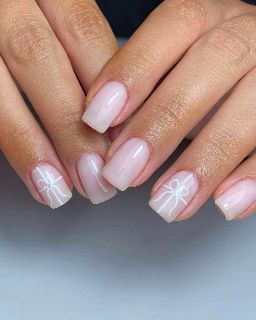 Barely-there blush with crisp White bow linework and soft- Square edges—this is the boardroom-approved take on gift-wrap nails. A single dot “knot” adds sparkle without tipping into glitter.