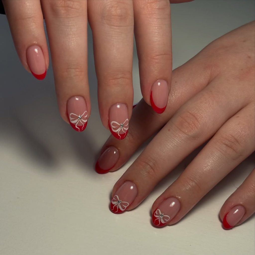 A sheer nude base meets crisp Red French tip s on every nail, while two accents add airy white bows dotted with tiny crystals for the “knot.” The silhouette is oval—soft, feminine, and camera-ready.
