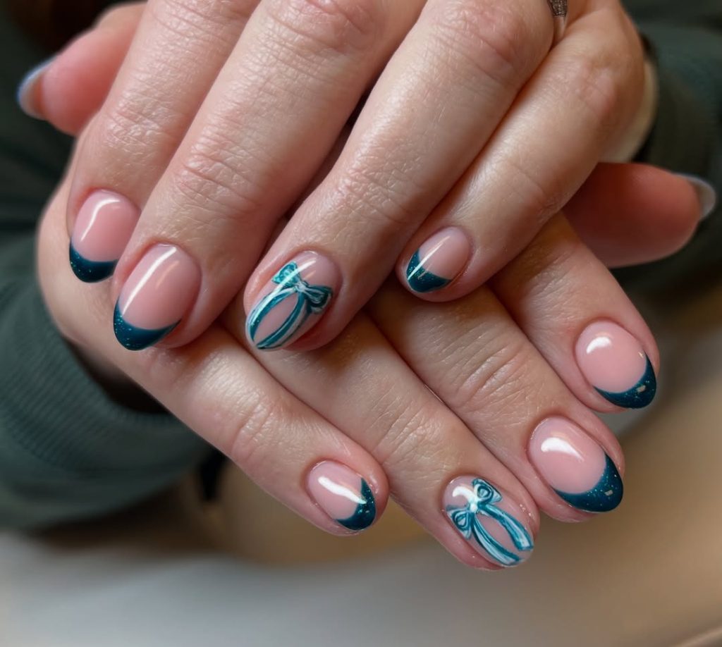 Dusty-teal French tip s sparkle subtly, while two accent nails get ribbon graphics and soft double-loop bows. The short, rounded Square silhouette keeps this refined—think gift-wrapped but grown-up.