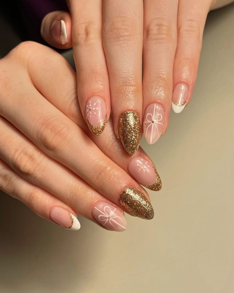 A party-ready combo: two full glitter gold nails, three sheer blush nails edged with micro gold, and crisp White bow graphics placed diagonally like luxe ribbon. Almond tips keep everything elegant.